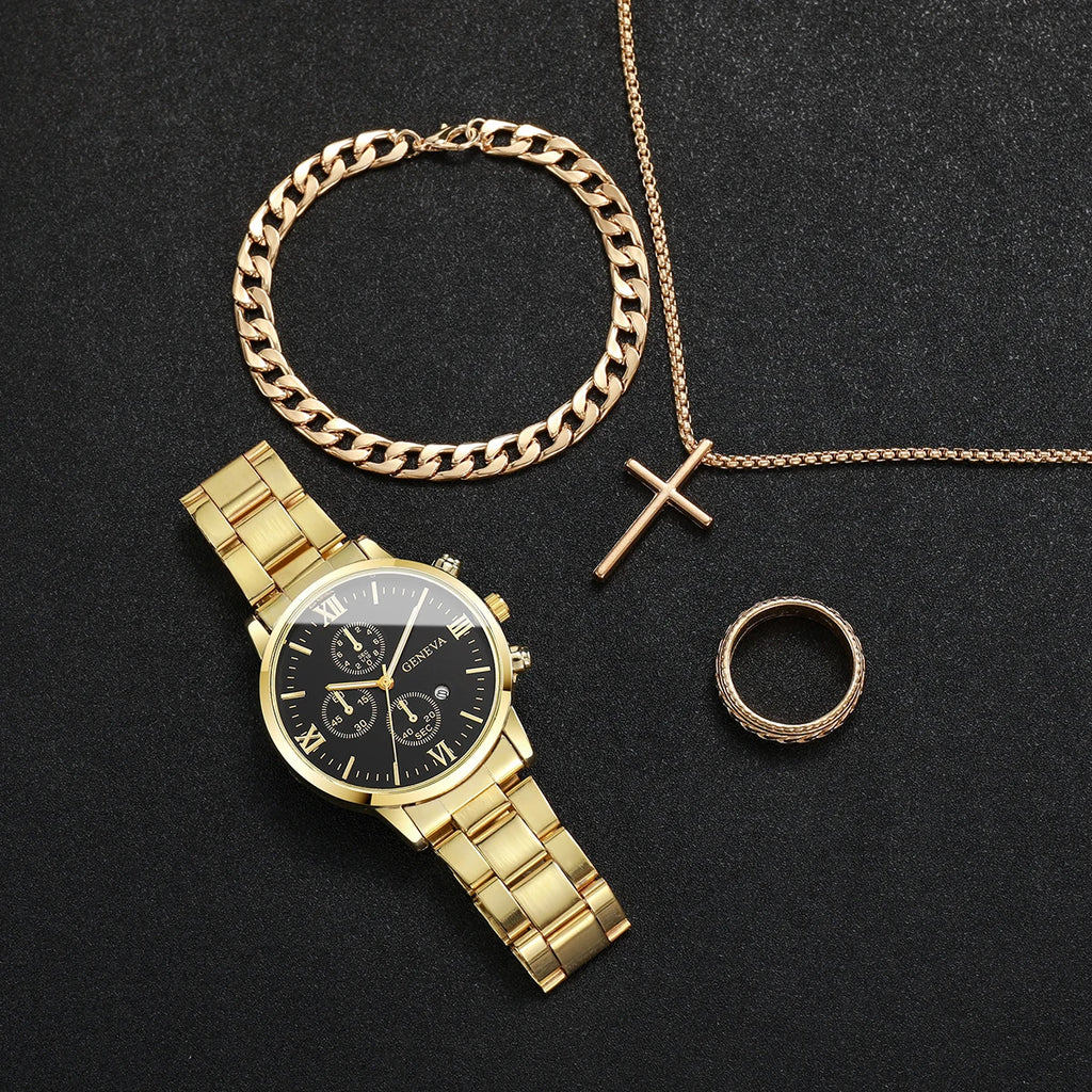 4PCS/Set Luxury Men Business Watches Fashion Roma Dial Calendar Quartz Watch Jewelry Set Reloj Hombre(Without Box)