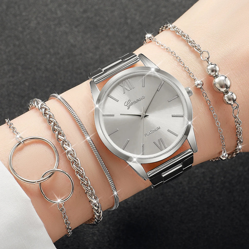 6PCS/Set Fashion Roma Dial Women Quartz Watch Silver Alloy Band Female Wrist Watches Bracelets Set(Without Box)