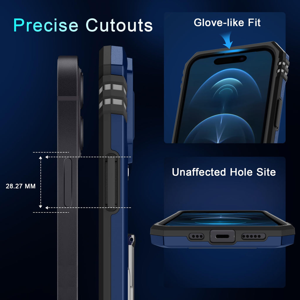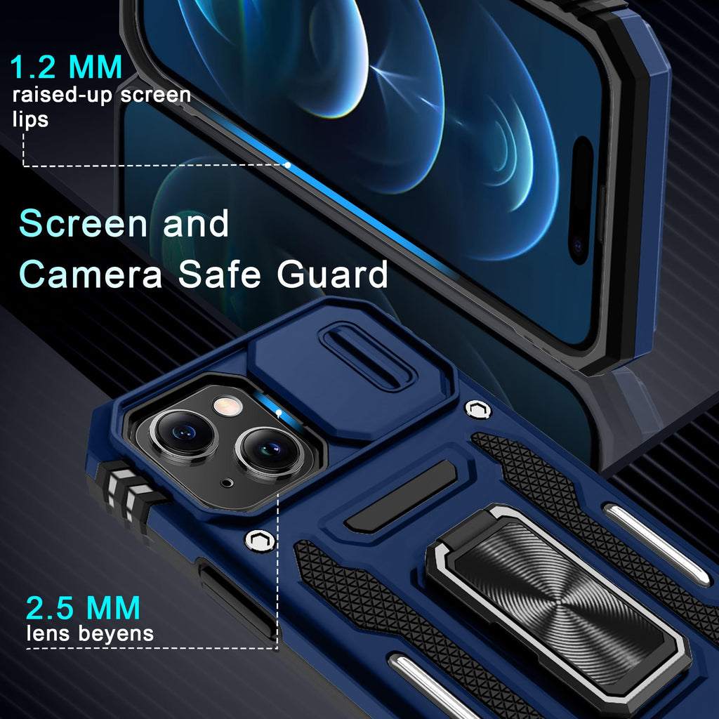 جراب BAHAHOUSES لهاتف iPhone 15 مع غطاء كاميرا منزلق، ومسند حلقي دوار، وغطاء واقٍ مقاوم للصدمات بدرجة عسكرية - أزرق داكن