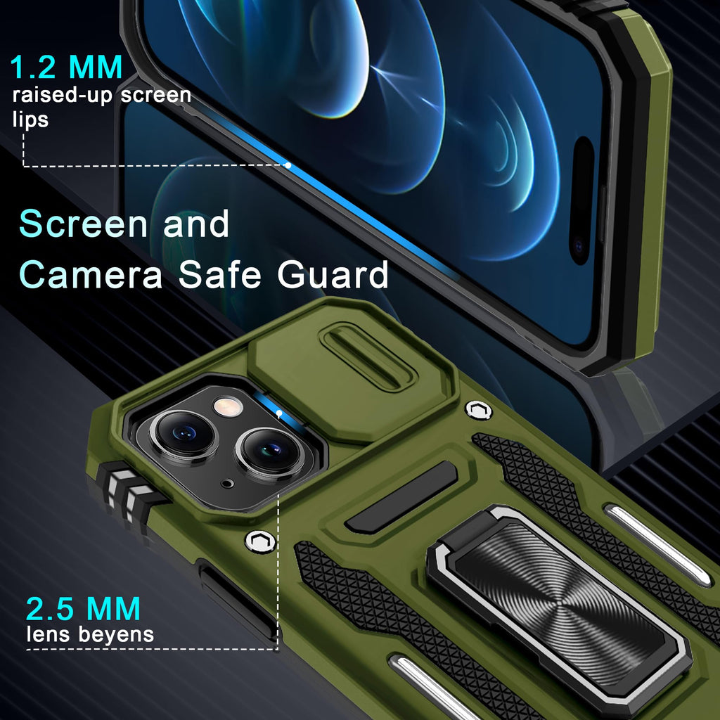 جراب BAHAHOUSES لهاتف iPhone 15 مع غطاء كاميرا منزلق، وحامل حلقي دوار، وغطاء واقٍ مقاوم للصدمات بدرجة عسكرية - أخضر زيتوني