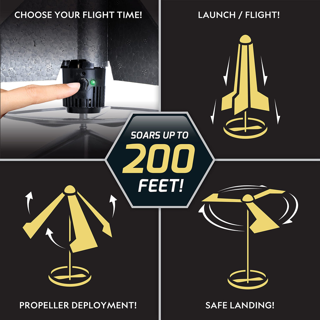 - سهولة الطيران مع هبوط آمن - يتضمن التصميم المبتكر شفرات دوارة تشبه المروحية والتي تمتد وتعيد صاروخك الآلي إلى الأرض بأمان.