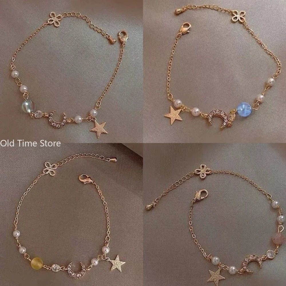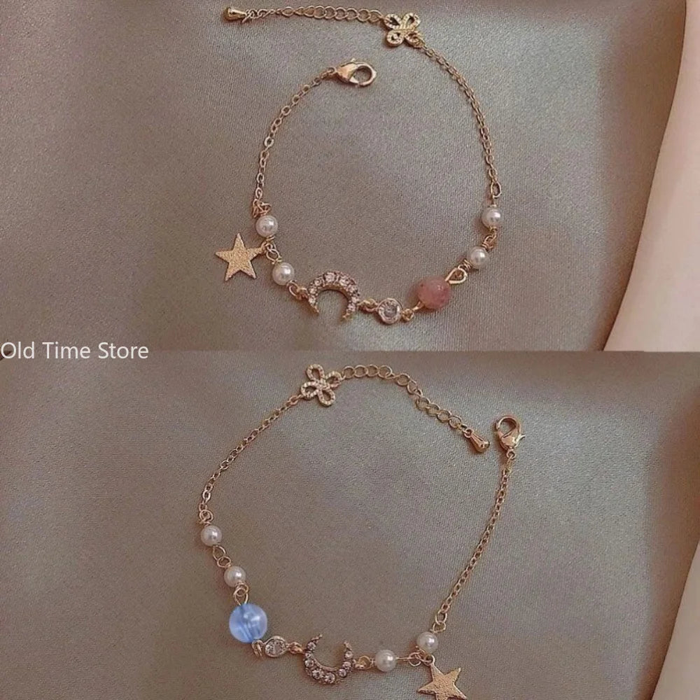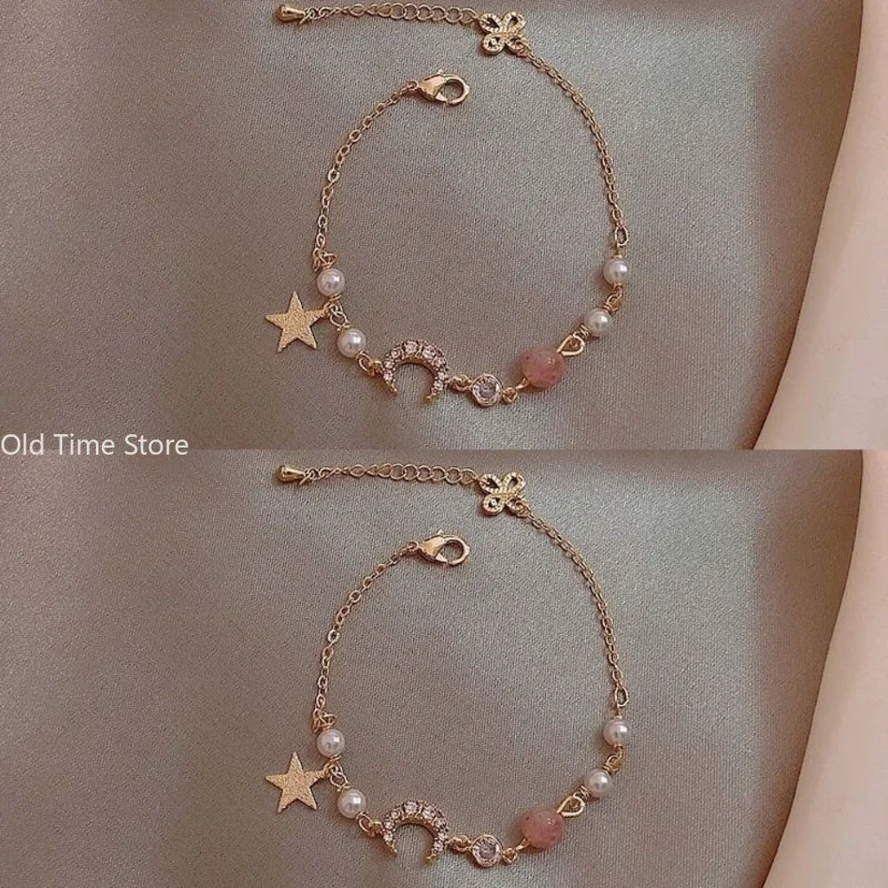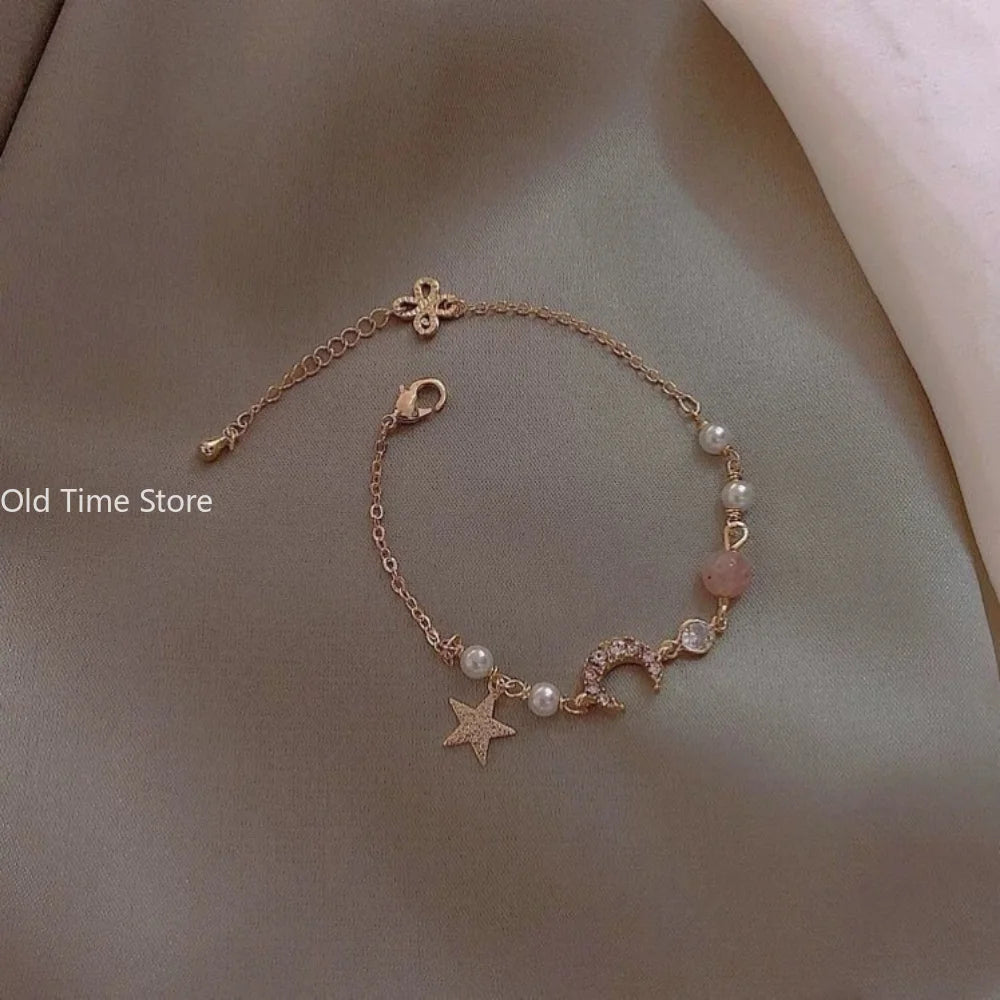 Simple Star Moon Zircon Pearl Bracelet for Women Ladies Cute Elegant Exquisite Shiny Link Chain Bracelet Charm Jewelry