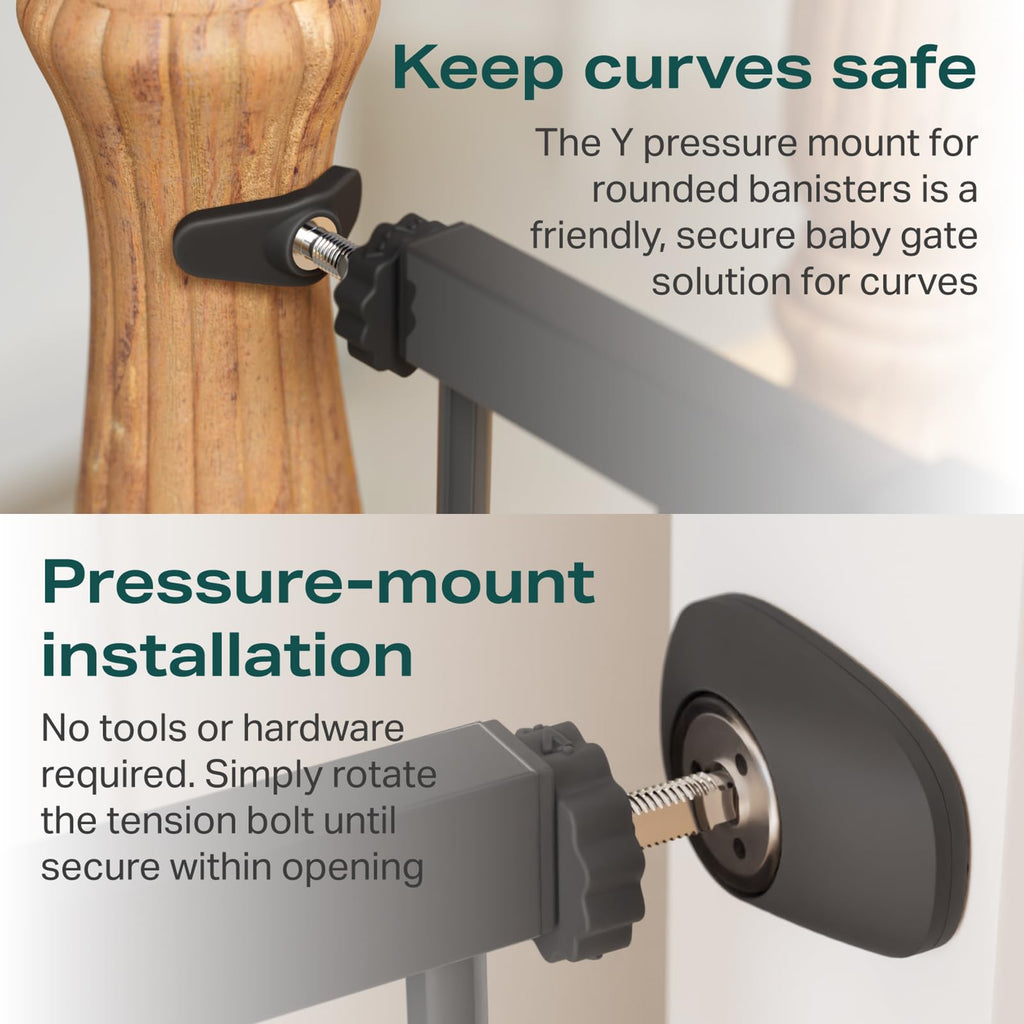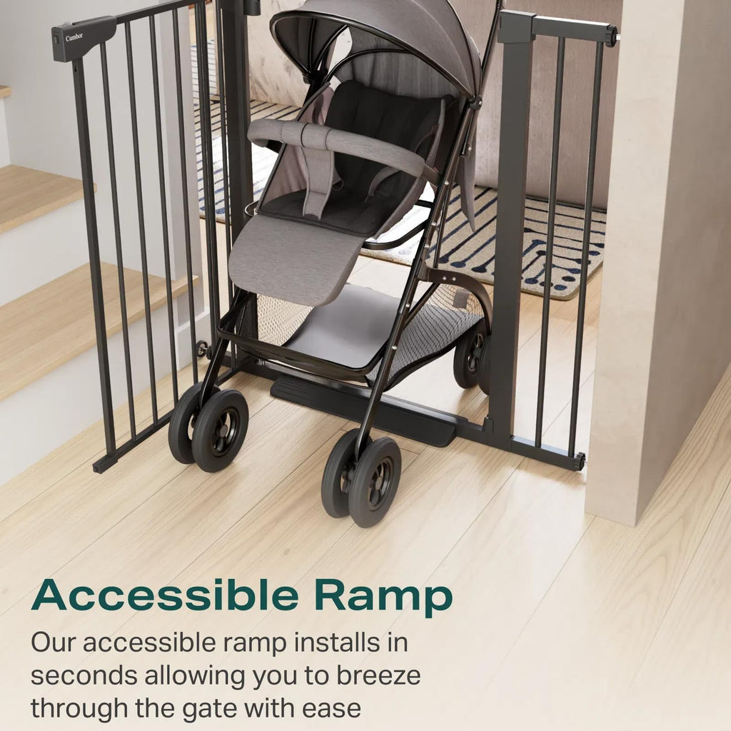 Cumbor Baby Gate---Your Childern's Safety GuardianCumbor baby gate is designed to keep baby and pets right where they are supposed to be. This sturdy baby gate can be opened easily with one hand and adjusted to fit the doorway and opening widths from 29.5 to 51.6 inches. Pressure mounting does not require any tools or drilling, which is fast and easy to install, causing no damage to the walls. The latch on the gate can lock the gate automatically, requiring no efforts, which will definitely create a safe space for your baby. We believe that mothers should be liberated from babysitting the kids around the clock, and enjoy their own time. Choose Cumbor now to really enjoy your time with babies and pets.Tips: ▶ For easier installation, don't cut the zip tie until the gate has been installed. ▶ The gap between the latch and frame is understandable, neither defective nor bended, and would be shortened after installation.▶ For installation, just place the gate at the doorways, stairs or any openings, then rotate the tension nuts until the space between the handle and latch is within 2mm. ▶ It is suggested to use wall cups if you want to install the gate at the top of stairs for better security. ▶ Designed for your convenience, the baby gate can be installed both via pressure mount or the included hardware to attach the gate to your wall.What You Will Also Get:Cumbor, as a leading brand of baby gate, is always committed to provide the superior shopping experience for its customers.