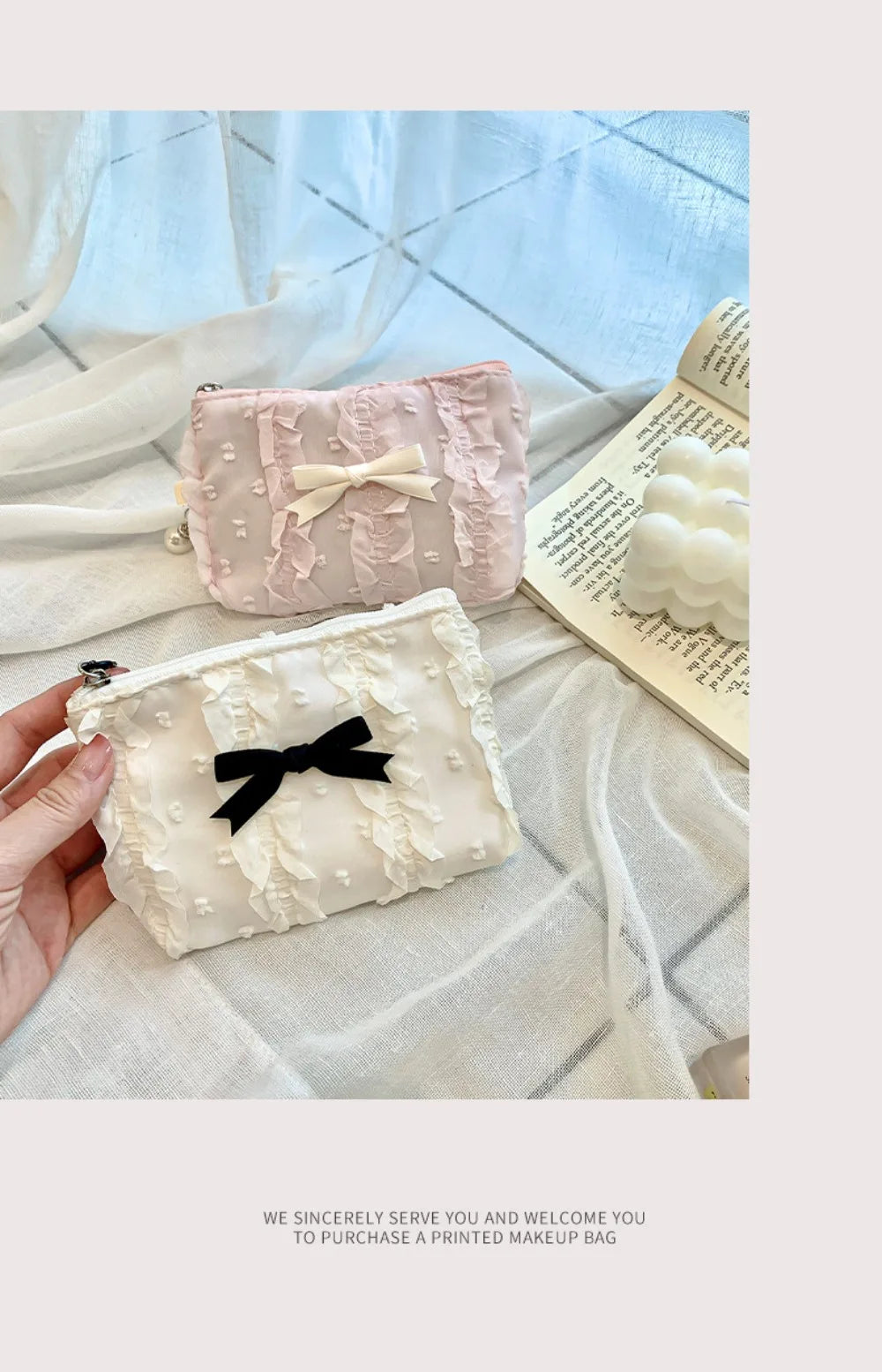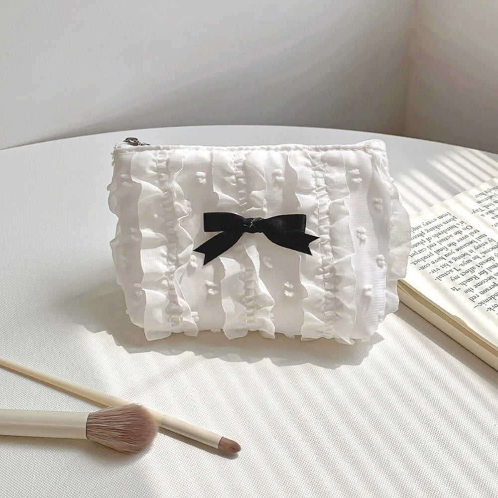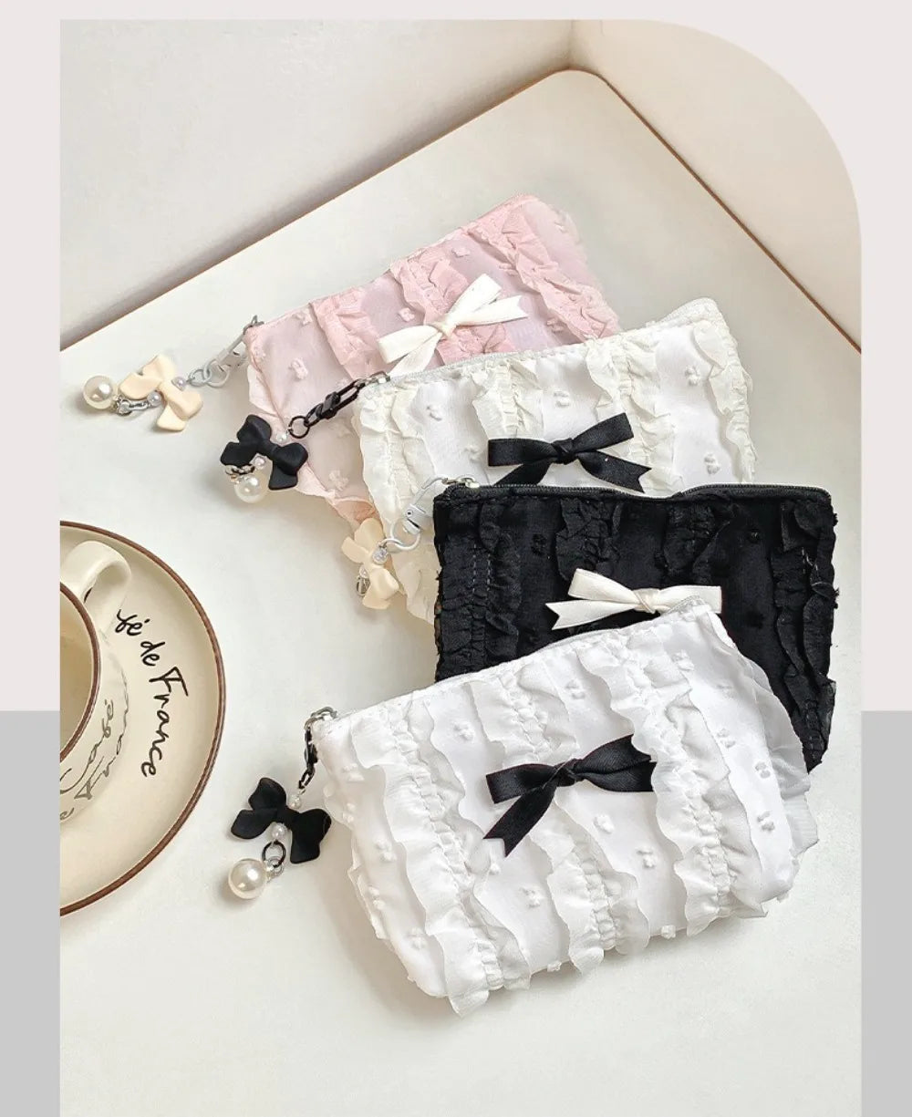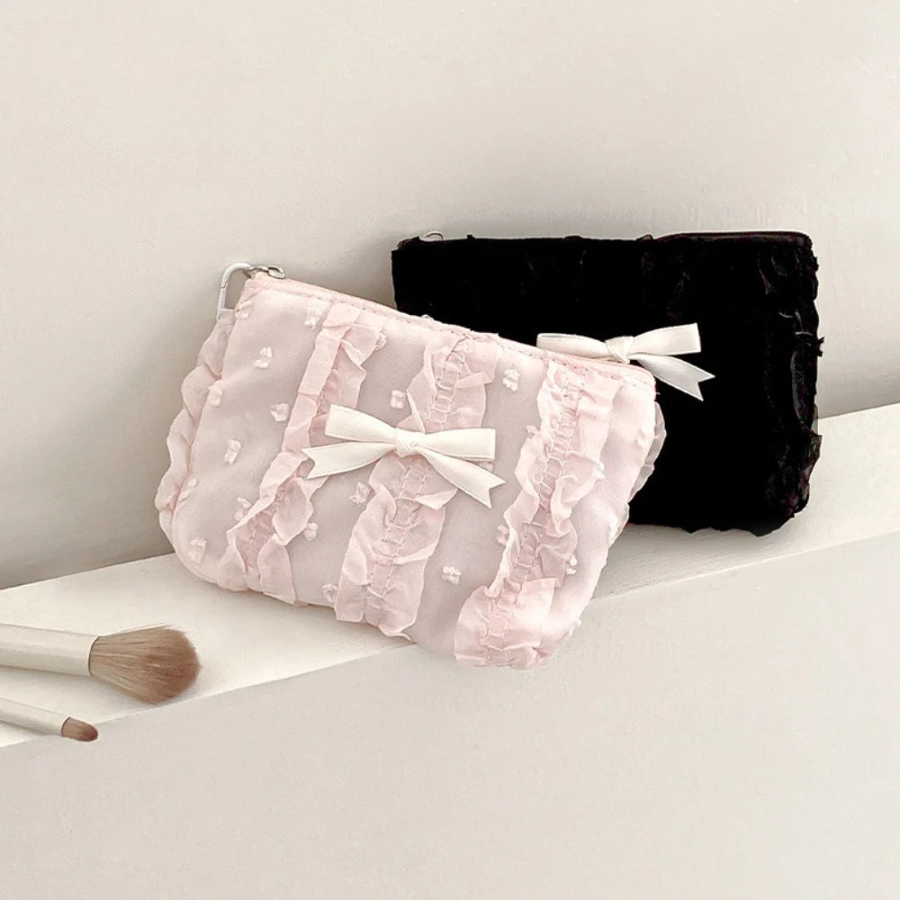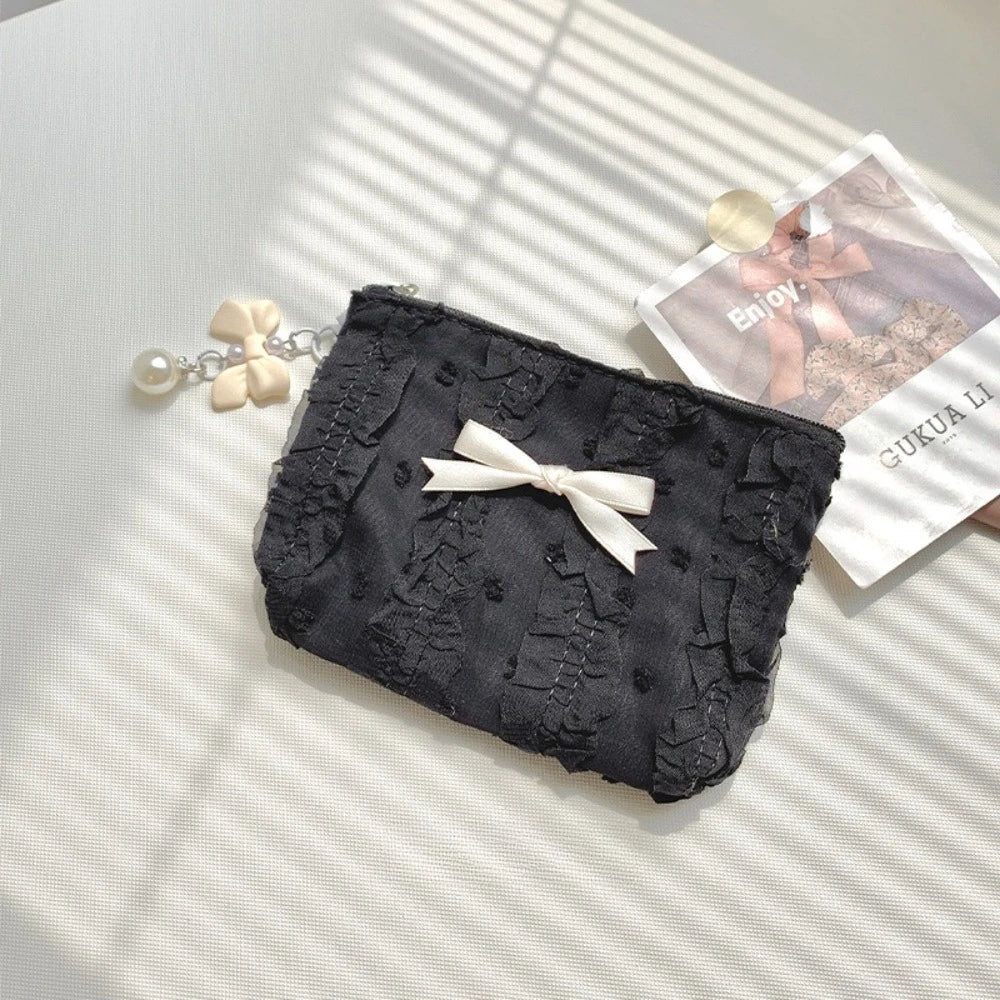 Cute Women Makeup Mini Bag Korean Lace Bow Portable Coin Purse Small Pouch Handbag Kawaii Female Cosmetic Storage Zipper Bag