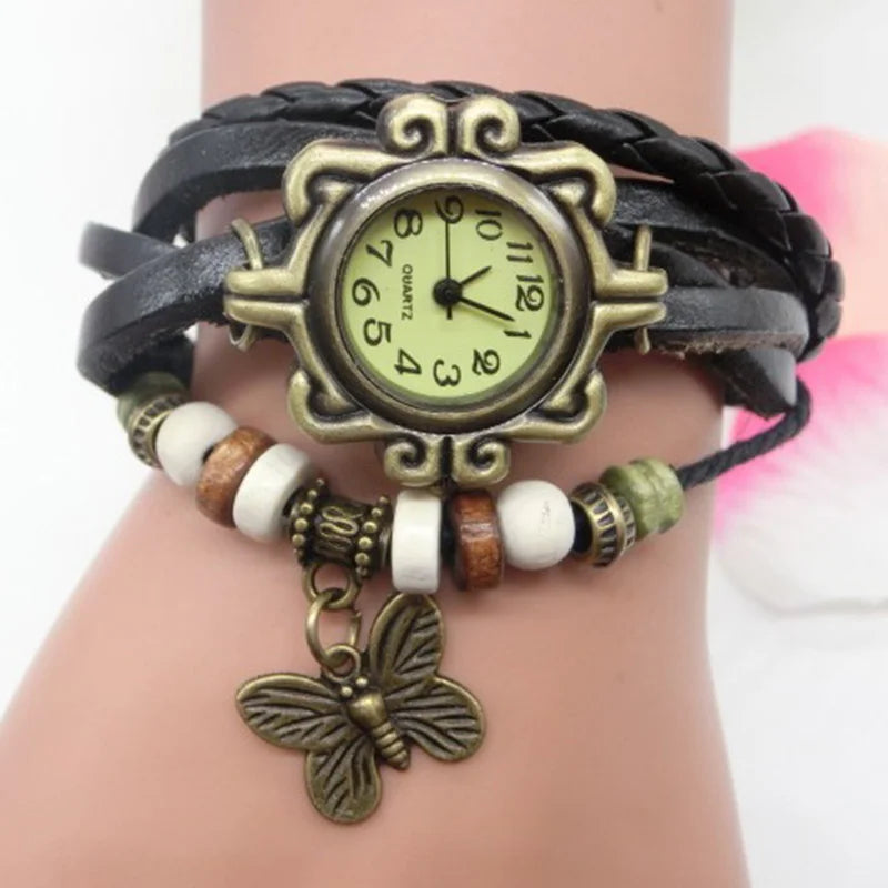 Fashion Retro Leather Strap Butterfly Pendant Women Bracelet Watch