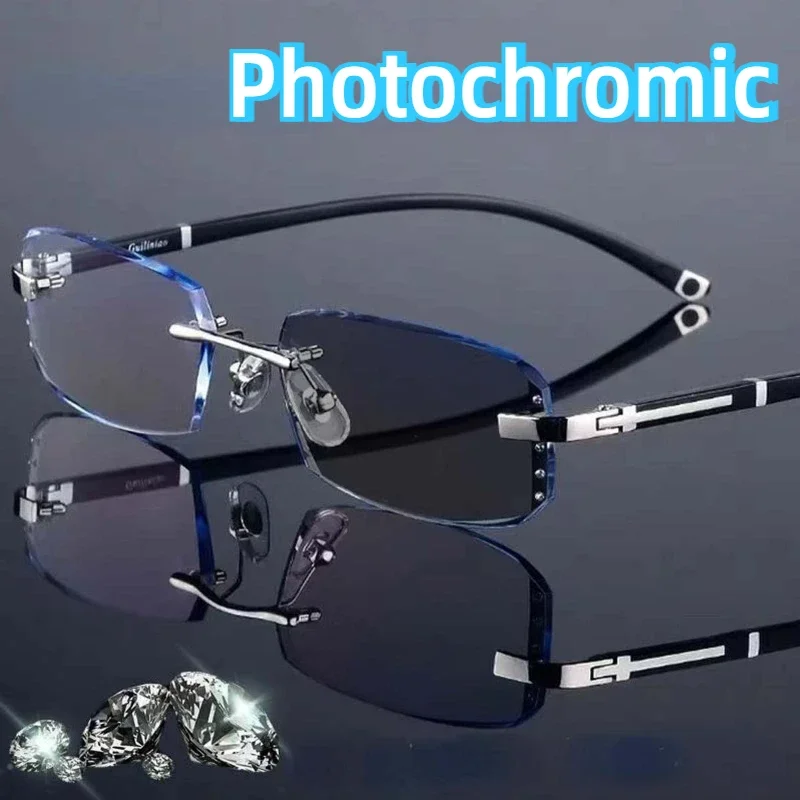 Luxury Diamond Cutting Photochromic Reading Glasses Men Business Rimless Eyeglasses Women Color Changing Presbyopia Eyewear