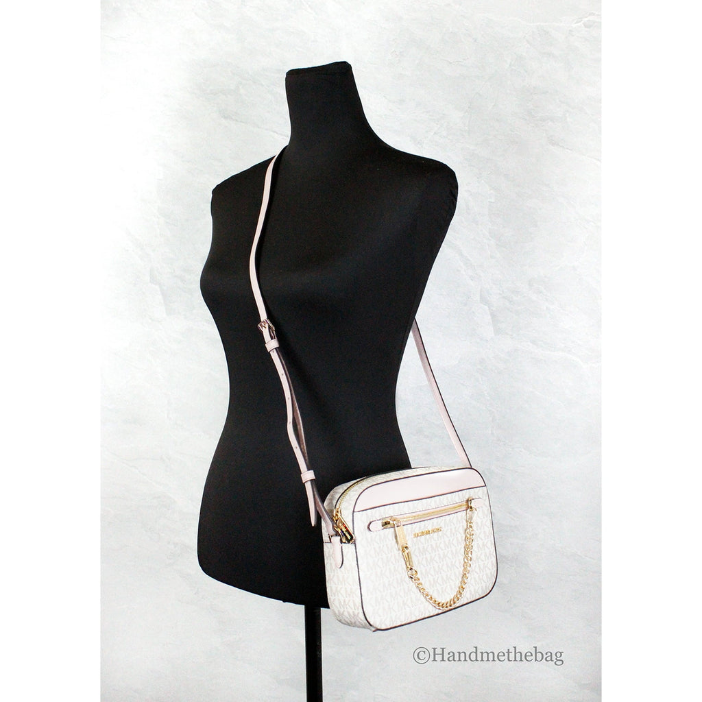 - Michael Kors Jet Set item large east west zip chain crossbody (vanilla signature/powder blush) material: signature PVC with saffiano leather features: 1 outer zip pocket with chain zipper accent, 2 outer slip pockets, 2 inner slip pockets, adjustable crossbody strap measures: 10 W x 6 H x 2.5 D