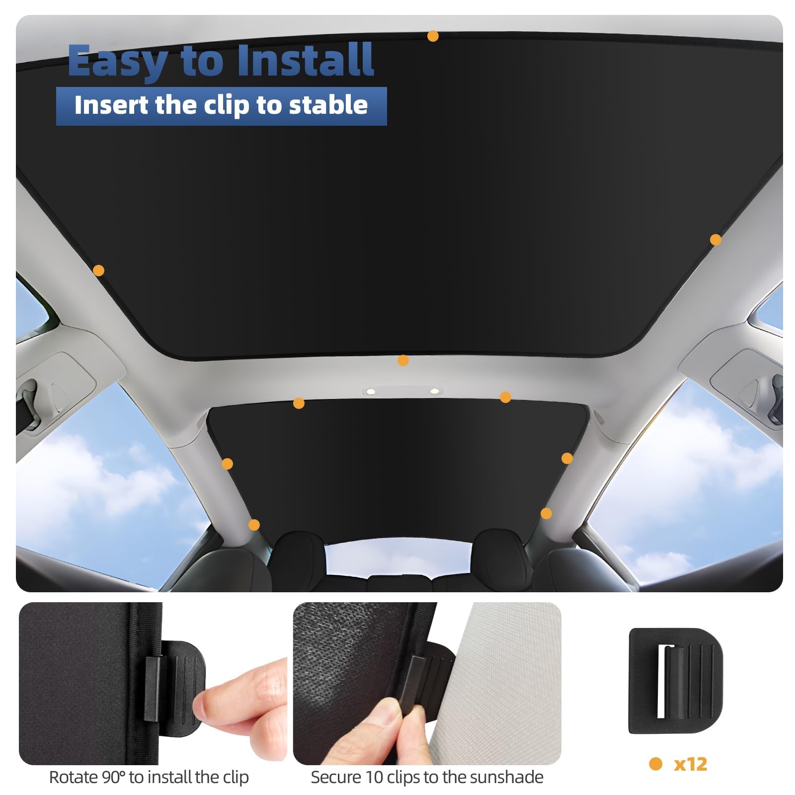 【Ultimate Sun Protection】Still troubled with the glass roof comes with direct sunlight and stuffy heat?No more scorching heat!TSLDRV Model 3 sunshade roof adopt exclusive silver dot reflection technology and ice sensitive fabric material that reached UPF50 level,which offer both you and car interior a completely maximized sun protection,block 99% harmful UV,rays and glare,instantly cool your car interior.Bring you and family with a more comfortable driving experience during the journey.
